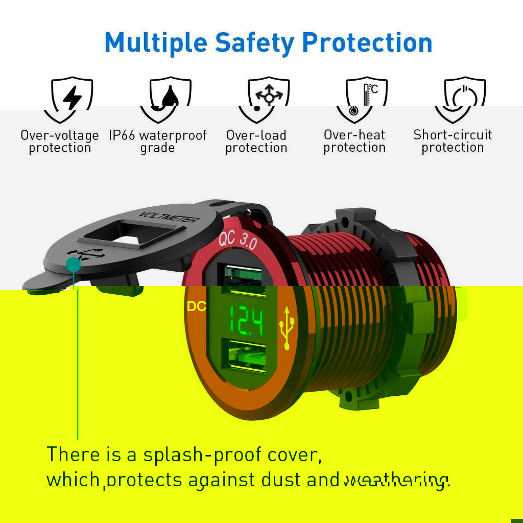 Die Spannungsanzeige inkl. der USB Ladebuchsen gibt es in den Farben rot, blau oder schwarz: