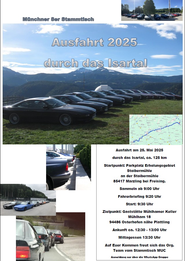 Ausfahrt von ca. 125 km, für bis zu 25 Autos, durch das Isartal, auf Nebenstrassen von Freising nach Plattling