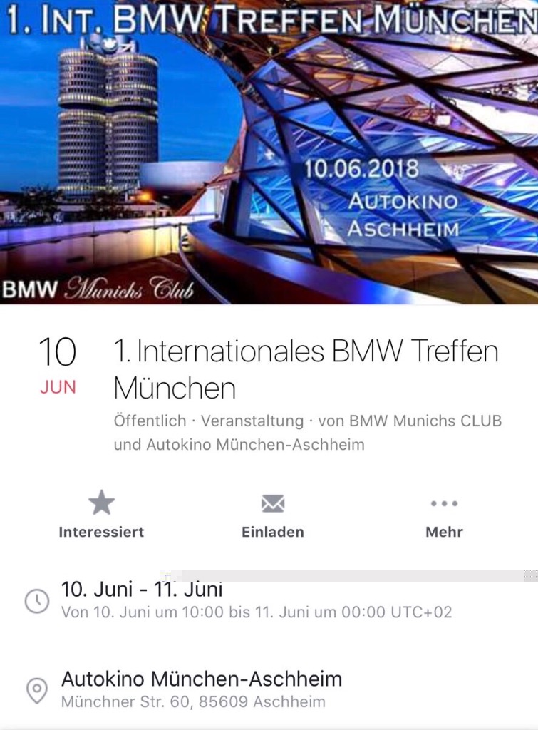möchte euch informieren dass es diesen Sonntag 10.06.2018 der 1.Int. BMW Treffen München stattfindet.